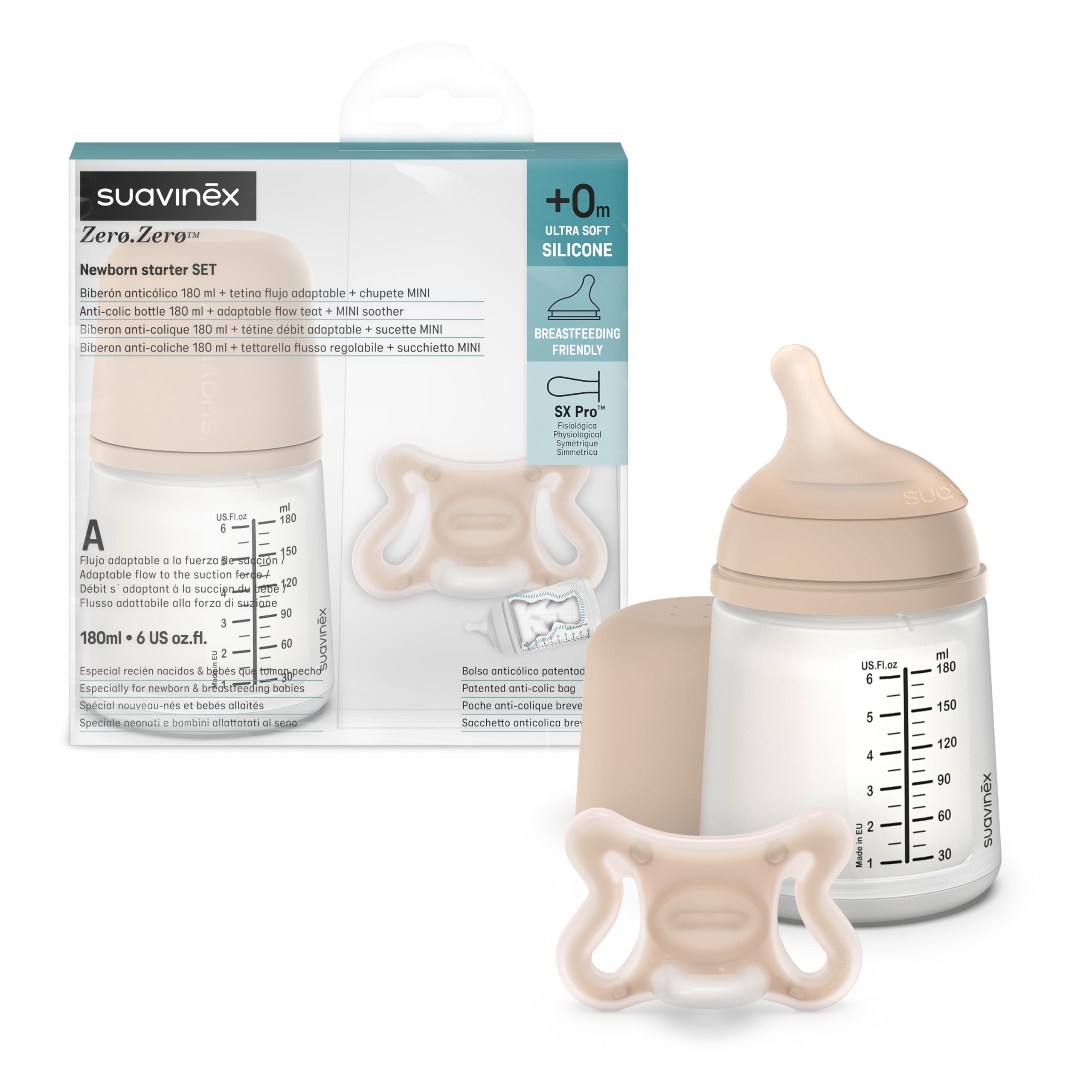 ![]() | Suavinex, Zestaw startowy Zero Zero, butelka antykolkowa 180 ml ze specjalnym smoczkiem do karmienia piersią + smoczek Zero Zero, mały smoczek dziecięcy Rozmiar (-2 do 2 miesięcy) z symetrycznym 180 ml - Spécial Allaitement (A) + Sucette Nowe opakowanie Ś | 50 zł | B0CPKZ8Z9G | 8426420079235 |